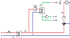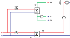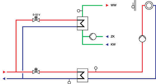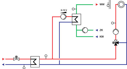 DDC-Compact Controller for the control of a domestic hot water circuit with a flow through system for 1 district heating circuit, 1 domestic hot water circuit, 1 heating circuit, energy management, up to 15 preprogrammed system diagrams 8 relais outputs, 1 transistor output, 1 x 0..10V output (fast control of a valve or a pump in the domestic hot water circuit), service interface, optimized timing for short reaction times. No danger of a disease (legionelles), no buffer or storage tank needed, no energy loss.